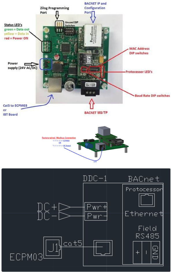 - All BACnet DDC options for ECPM03 based controllers (DCV, SC, and HVLS) and IBT controllers (pre-MUA red board) will now utilize a new board called CAS BACnet Gateway. This board will replace BACnet ProtoNodes.