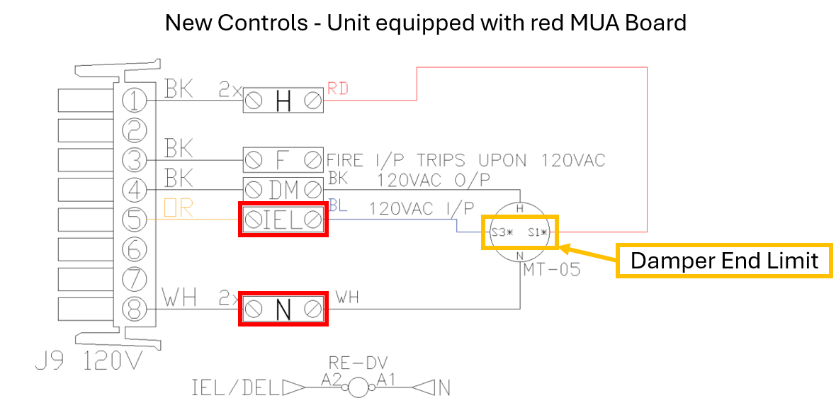 - If the damper is open and the unit has new controls, measure AC voltage across terminals IEL and N.