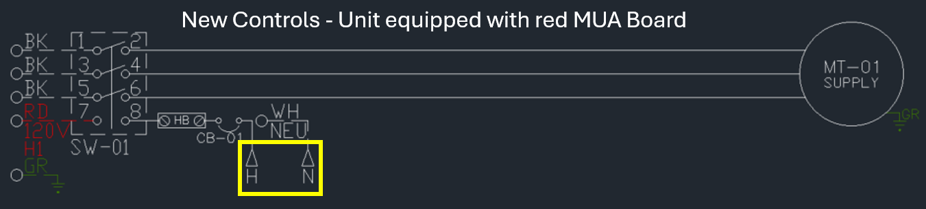 - For units with new controls (equipped with red MUA Board), check for 120 VAC across terminal blocks H and N.