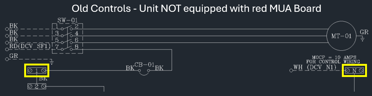 - For units with old controls, (NOT equipped with red MUA Board) check for 120 VAC across terminal blocks 1 and N.