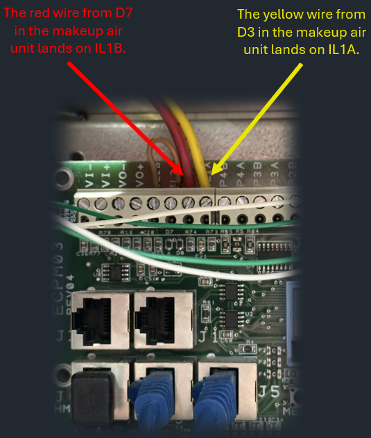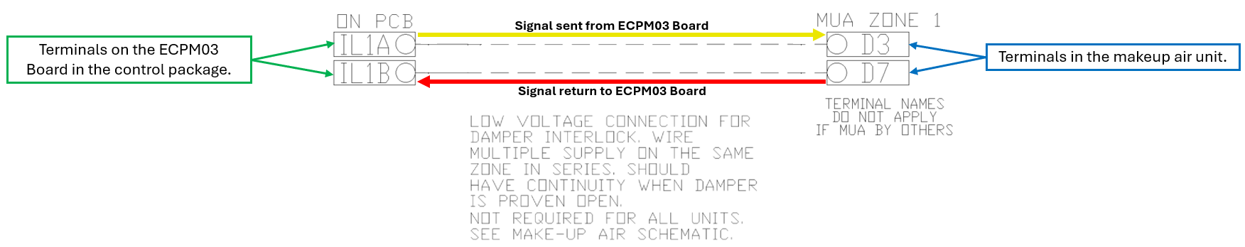 This allows the signal from IL1A on the ECPM03 Board to return to IL1B on the ECPM03 Board and the control package will allow the makeup air unit to run.