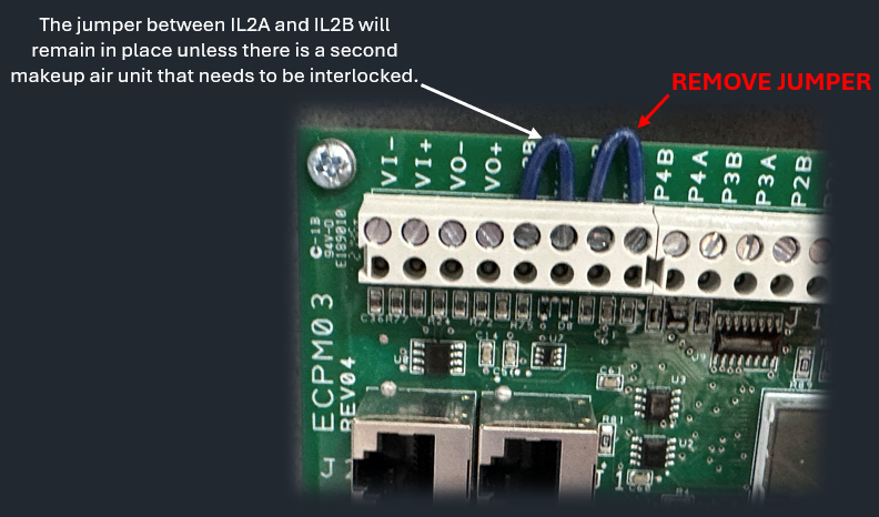9. Once all wiring and component operation is confirmed, The jumper between IL1A and IL1B on the ECPM03 Board can be removed and the wires from the makeup air unit can be reconnected.
